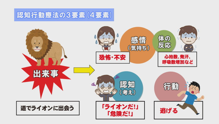 認知行動療法では、自分がどんな「感情(気持ち)」で、どんな「体の反応」や「認知(考え)に影響されて「行動」しているのかを客観的に捉えることが大事なポイントになってきます。