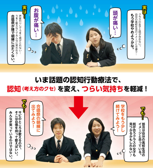 生徒の考え方を否定して、無理矢理変えさせるのではなく、ネガティブな考えを受け入れた上で(受容)、バランスの取れた別の考えを見つける(変化)点が、認知行動療法の素晴らしい部分だと思います。