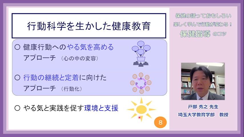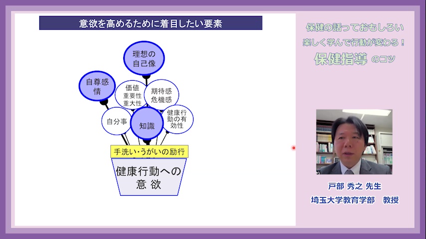 今回は、埼玉大学教育学部教授の戸部秀之先生に養護教諭のために「子どもの動機付け、行動変容」について理論的に解説していただきます。