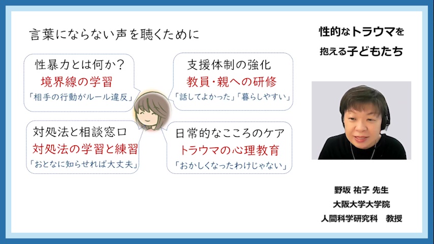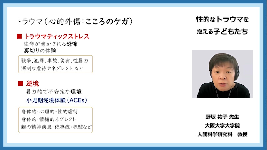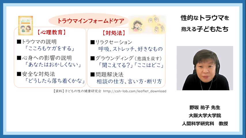 トラウマについてやトラウマになりやすい性被害について、子どもから性被害を打ち明けられたらどう対応すればよいのか、トラウマの影響を考慮した話の聞き方とはなど具体的に解説します。そして支援者の傷つき(影響)についてにも触れます。