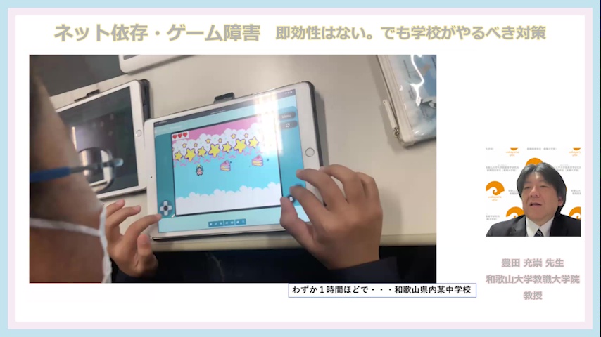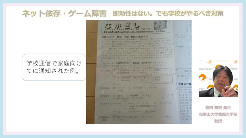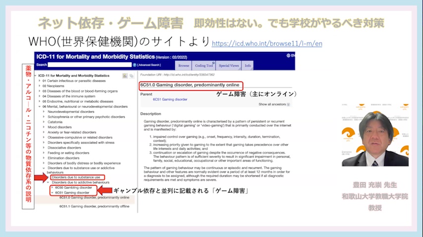 この講義は、学校からの依存症への相談に対応するため、「児童生徒らの依存状況の実態把握の方法」や「予防教育等」の具体例について考えていきます。
