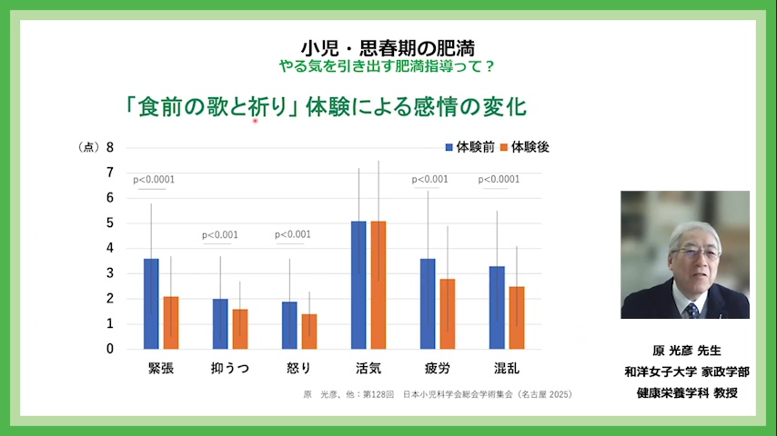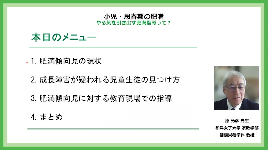 講義は、①肥満傾向児の現状 ②成長障害が疑われる児童生徒の見つけ方 そして?肥満傾向児に対する教育現場での指導の順に展開されます。