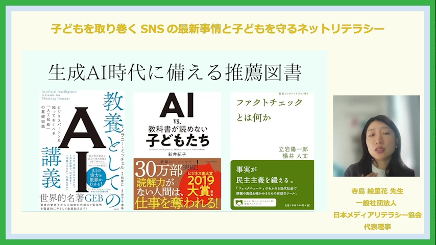 こんな時代に学校としてはまた家庭としてはどう対応すれば良いのか?? 最後に「AIリテラシー」という言葉をあげ、今後日本においても広く普及し、教育現場や地域社会、家庭において欠かせない視点となっていくことを示します。